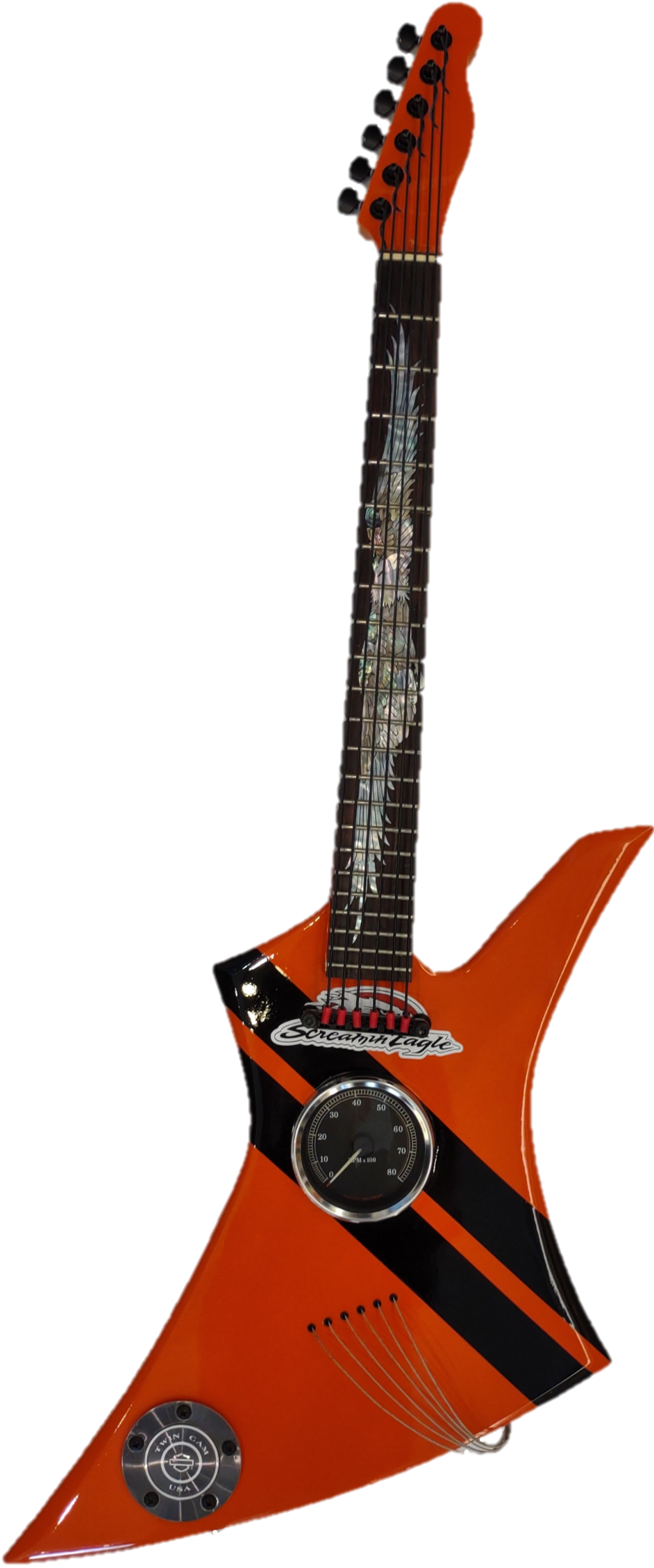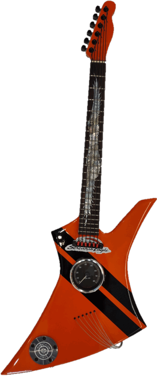 How do you fill the seemingly endless days of Corona Virus inactivity? That depends. If you are loaded with creative juices that won’t go away, you might just let them flow into the next creative hobby. If you are a “car guy” with a garage full of parts and lots of time on your hands, and in Jim’s case, a singular, used guitar purchased on a whim, you might put them together and see what evolves. Thus was born guitarsAScars in Jim’s specialty garage, a new endeavor for a man full of creative ideas outside his decades-long career designing homes. One guitar purchase led to the next guitar purchase, and then another, always old, well-used instruments that would be “enhanced” with artistic new life by the addition of, what else? Car parts! And miscellaneous guitar parts, striking paint design, and of course, the occasional Corona beer bottle cap. Sometimes desired parts can’t be easily obtained and must be hand-made. No problem. Where there’s a will, there’s a way. Each piece is one of a kind with errors, flaws and imperfections. THE GUITARS ARE NOT PLAYABLE! Their new life is that of a piece of art, sometimes themed, often completely random and always unique. Other car guys will recognize the pieces used. Guitarists will find recognizable parts as well. If you aren’t one or the other, you will find lots to appreciate just looking!