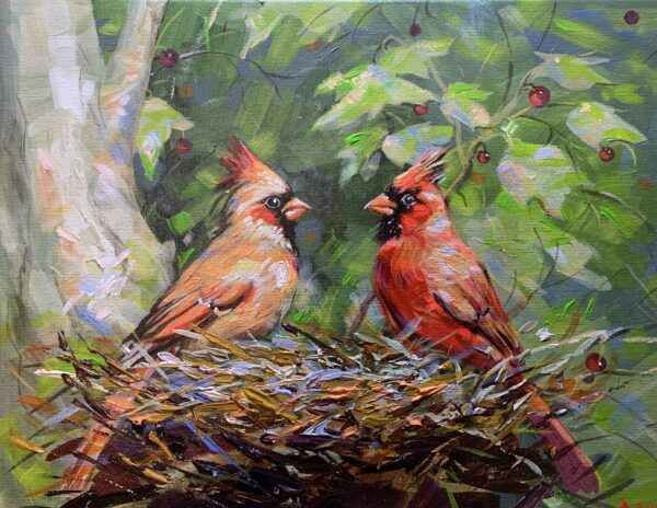 Family of Cardinals – Olha Mosieieva – 11″ x 14″ – Oil on Canvas