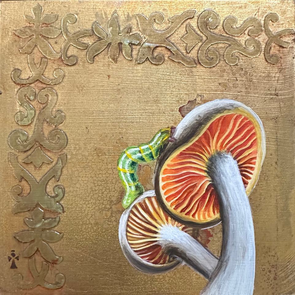 Home Mushroom – Angeles Salinas – 6″ x 6″ x 1.5″ – Acrylic and Metallic Foil on Wooden Panel