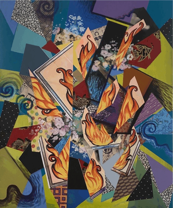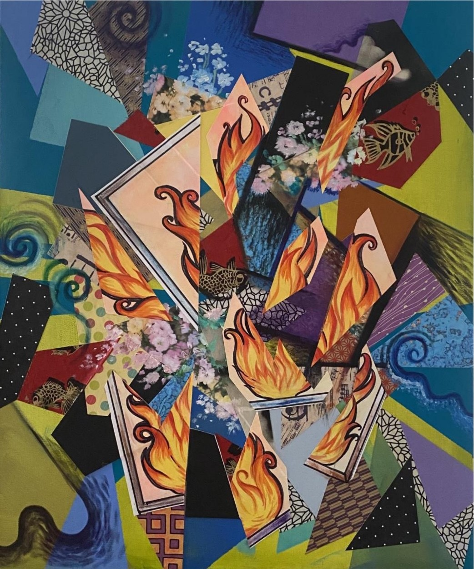 My synthetic cubist paintings are like a stream of consciousness, which starts with a collage of randomly placed pieces and textures. The universe is broken down into colors and shapes via the rationale that it is comprised of circles and right angles; I paint while remaining consciously aware of color blocking and shapes. This collage style of synthetic cubism challenges and strengthens my sense of aesthetics. The cubist paintings depict the mundane in a colorful, vibrant, and transparent way, by expressing movement in the mundane objects as frenetic textural juxtaposition of shape, pattern, and color. I have developed an interconnection of self and the environment that space and time are interdependent and intermingled.