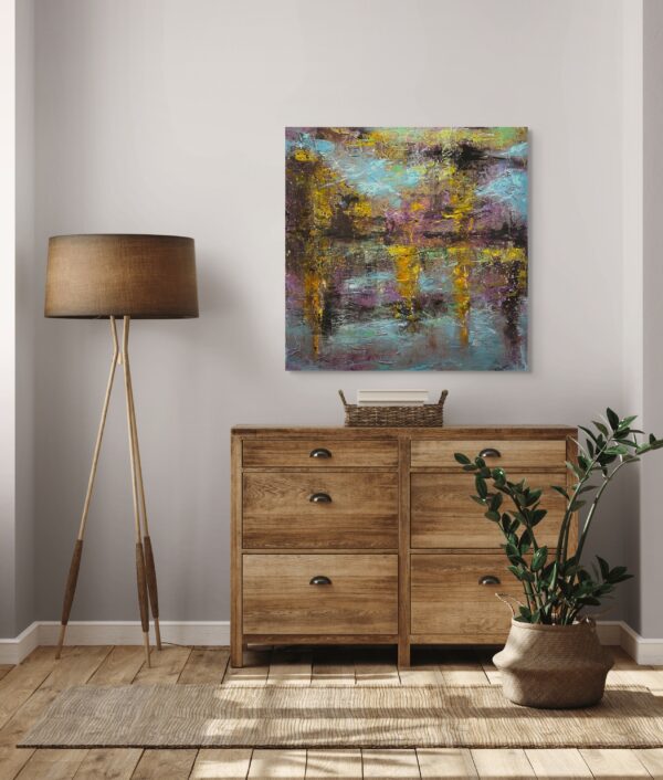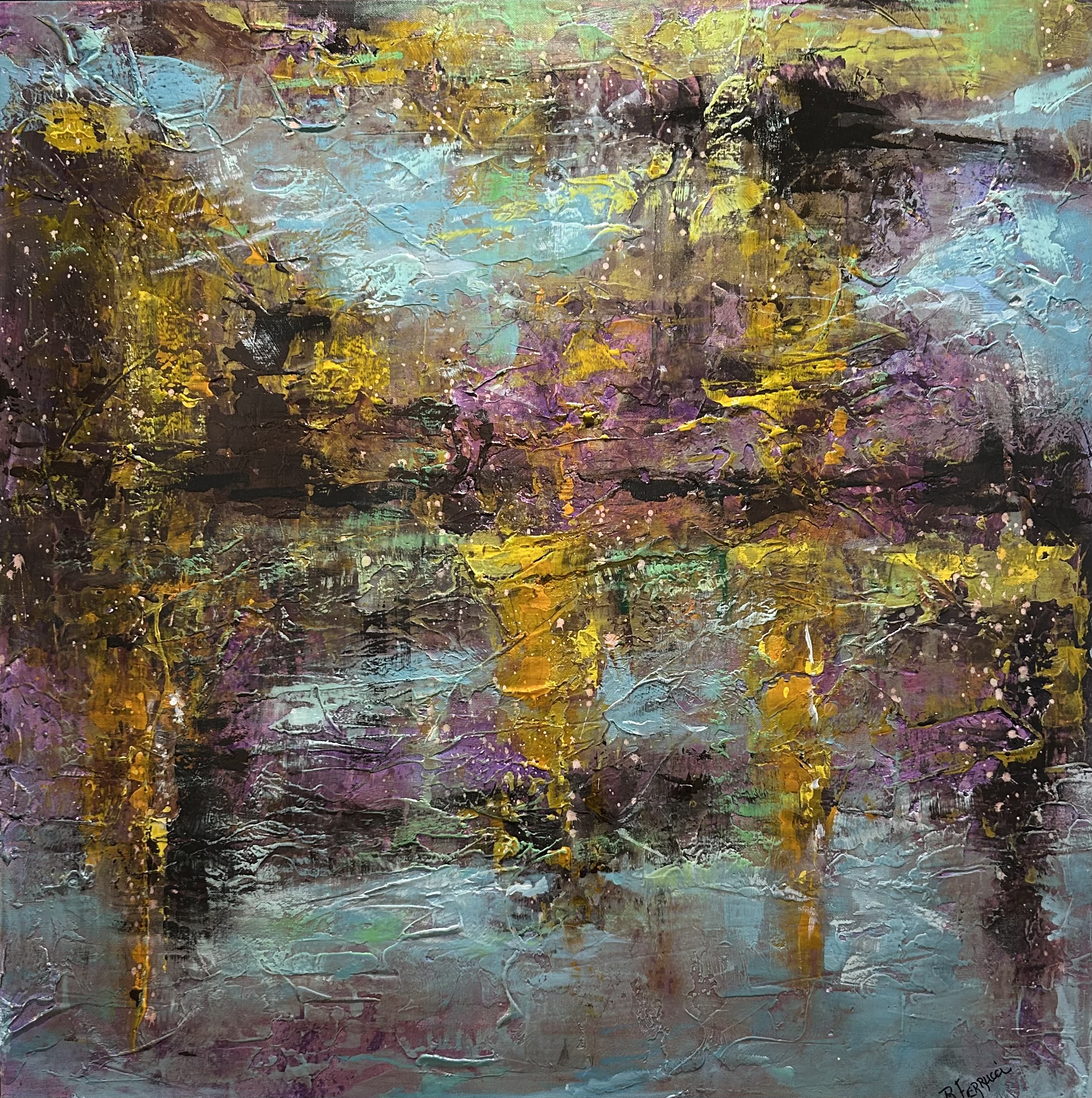 Bob’s new work can best be described as Abstract Expressionism. The paintings are filled with emotion, colors that range from muted to bright, full and splashing. Most of the work is mixed media with the use of acrylic, oil pastel, tissue and layers and layers of tinting. The paintings are in part done flat to give them time to dry without dripping, but much of the work is on the easel helping to bring out areas and push things in a distant space with brush work to define areas and shapes.. “A path to a higher ideal – be still, be mindful, be grateful.”
